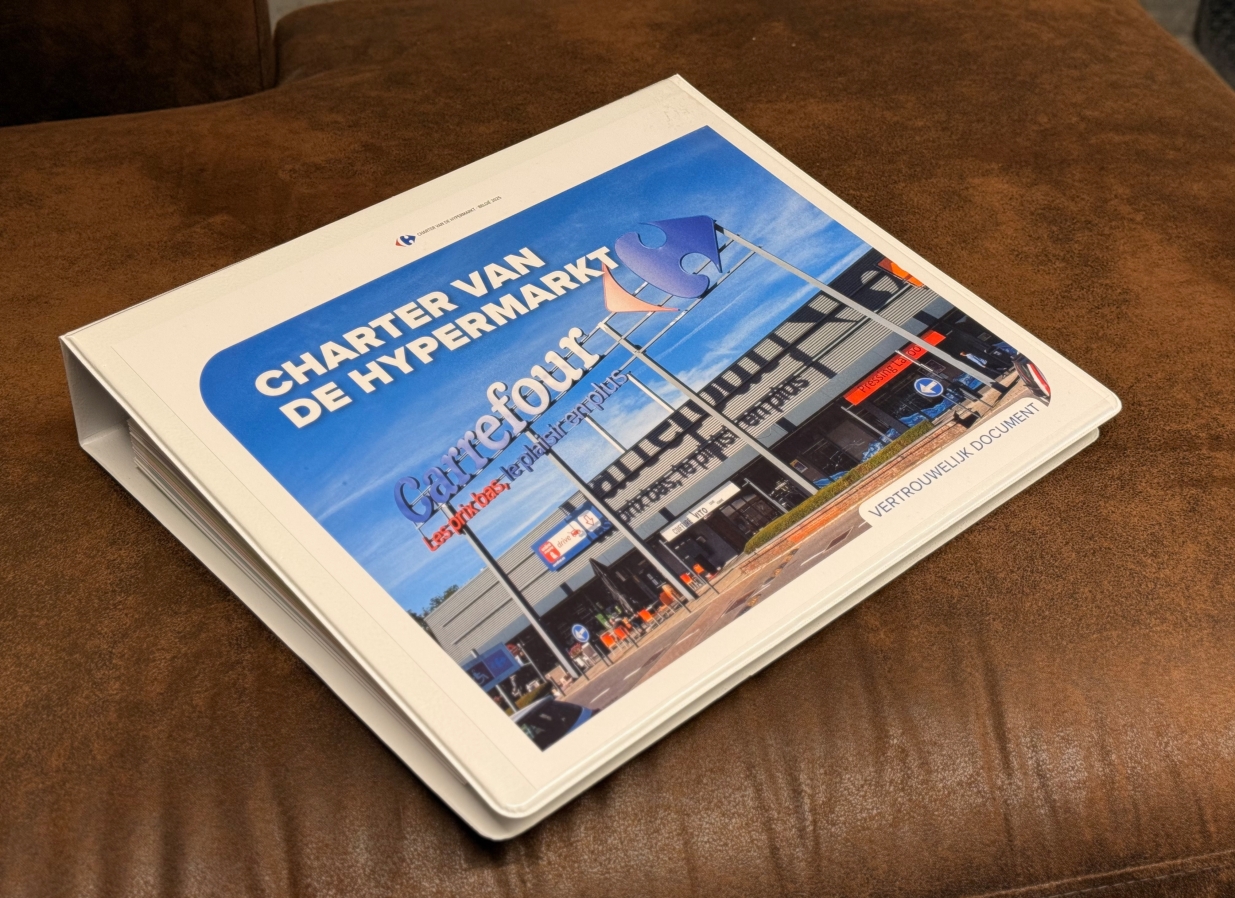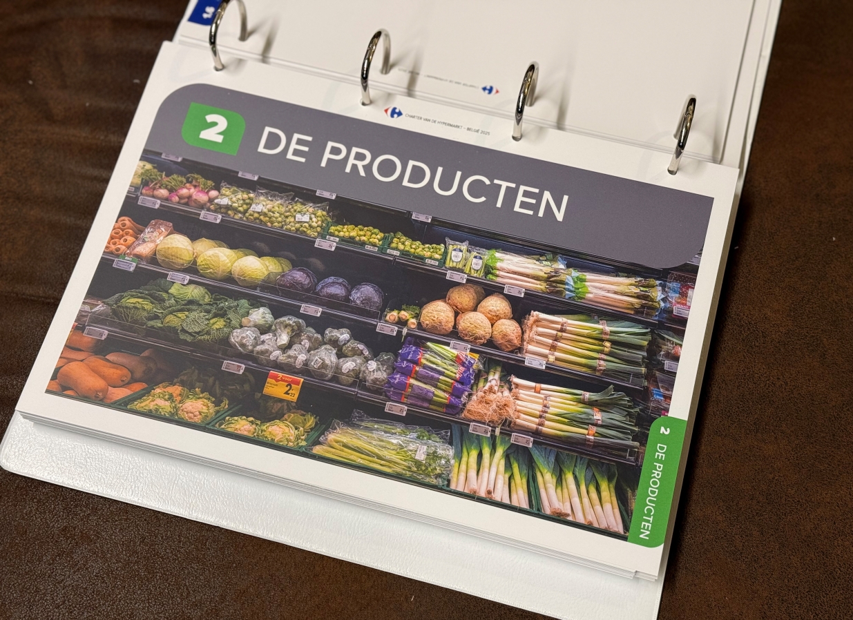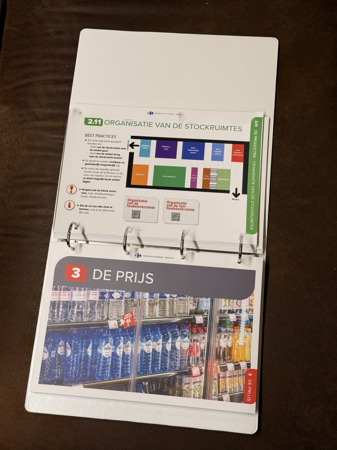 Beyond the physical production of the guide (binders with sheets and dividers), extensive collaborative work was carried out with Carrefour to compile, organise and simplify information from diverse sources, requiring a complete rewrite.
